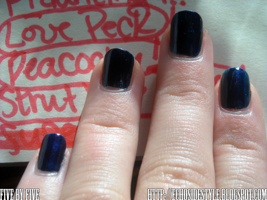 Here are my nails against my MAC Peacocky wish list haha! Elegant! As you can see in this natural light shot the shimmer is not as evident when there isn't bright light shining on. I do love the darkness of this polish; it looks near black in low light.